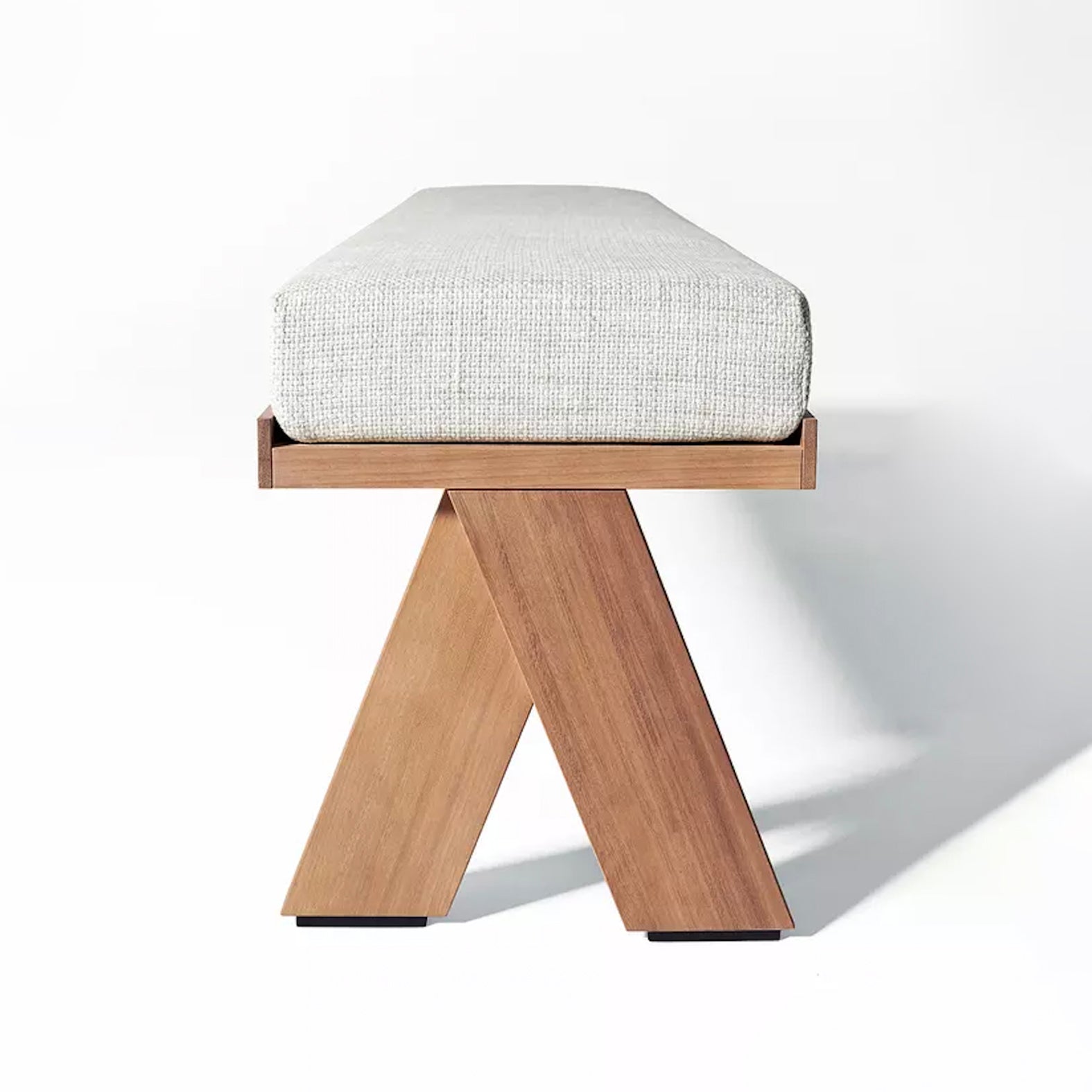 A real bench for those who love living outside: Joi Open Air has a basement in solid iroko wood, featured by visually pure lines. The extremely comfortable padded seat can be covered in the many outdoor fabrics in collection