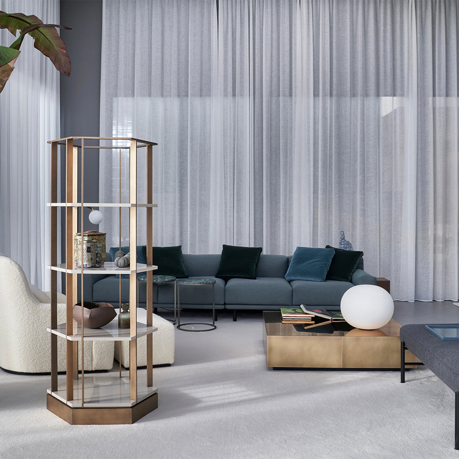 Shape anticipates function, so that 'décor' is freed from an imposed destination. Also meant to be a dividing element, Sebastian bookcase has a hexagonal metal frame with a bronzed brass, platinum steel or a matt black finish. The match of the outer finishes with the matt or glossy lacquer of the shelves conveys a contemporary appeal.